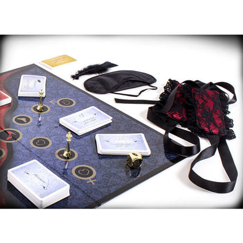 • Hvad er der i boksen: 252 kort; Game Board; 2 metal bønder; metal terninger; stilfulde håndjern; med bind for øjnene; pisk; fjer; duftlys; rosenblade; regelbog