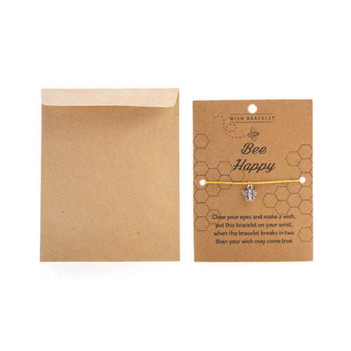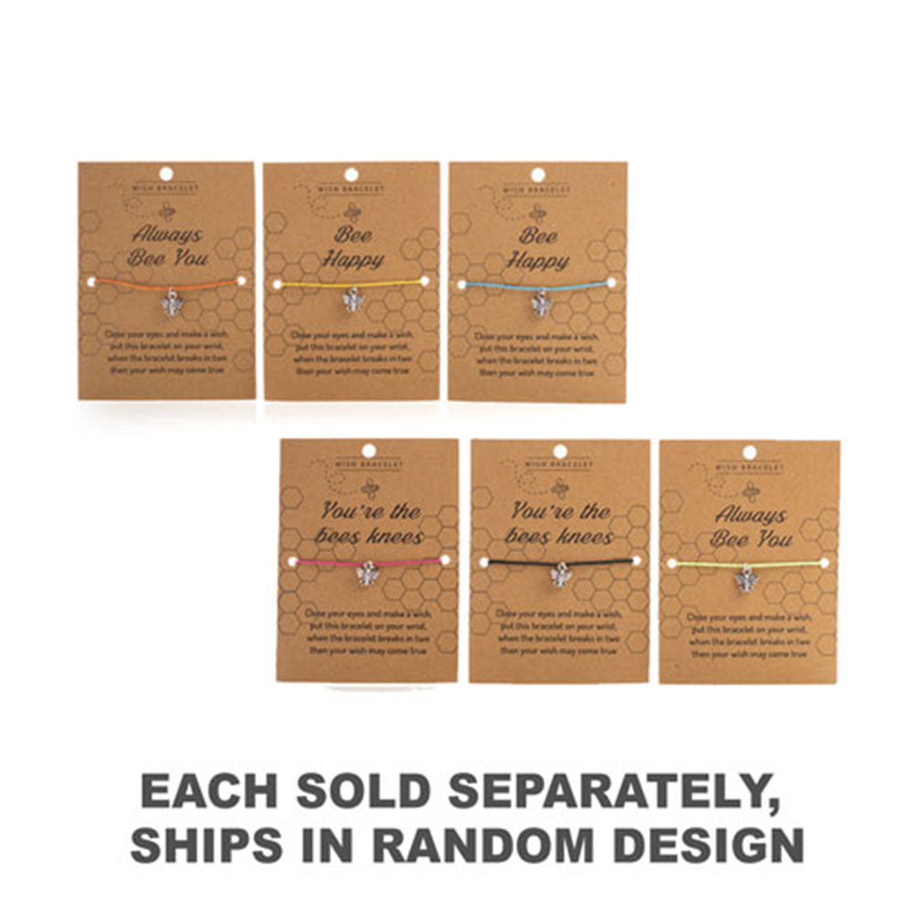 Close your eyes and make a wish with this bee-autiful hand-made wish bracelet. Features a silver bee charm on an adjustable cord. Comes with a gift card and envelope