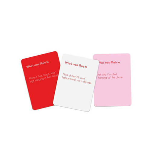 Assign each 'Who's most likely to' card to the player it suits best, and by the end the one with the most cards will be revealed as the biggest bottomless brunching, quinoa munching,