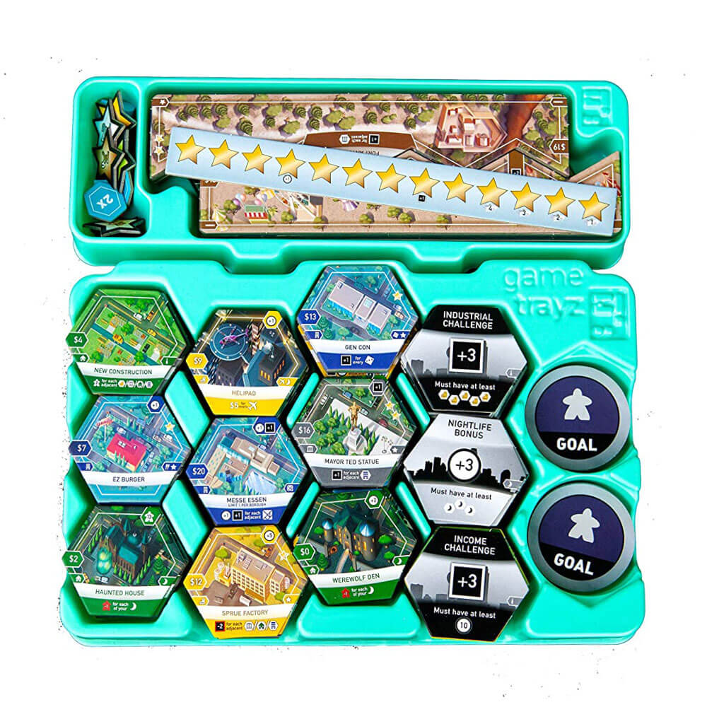 This box is organized with GameTrayz organizers and made to be combined with the second edition of Suburbia, which has larger tiles than in the original release.
