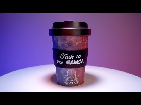 - Matchende sort anti-spill låg og beskyttende silikonebånd med Punny sætning 'Talk to the Hamsa'.