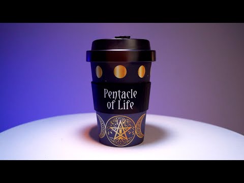 - Matchende sort anti-spill låg og beskyttende silikonebånd med 'pentakel af livet' i en slående hvid skrifttype.