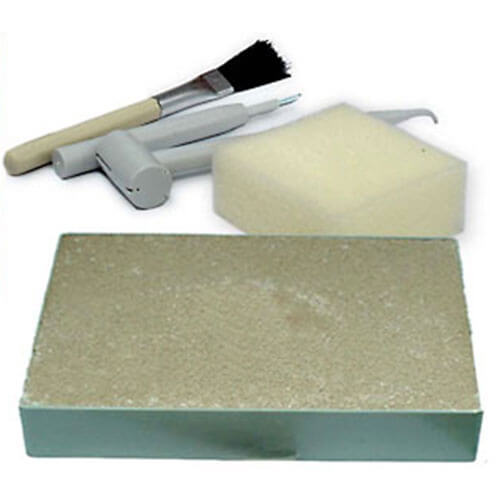 Udgrav skelettet fra blokken og samles derefter for at udgøre denne kvalitetsreplik. Skelettet består af ca. 8 stykker, og paleontologens værktøjer (Hammer og mejsel) er inkluderet i emballagen.