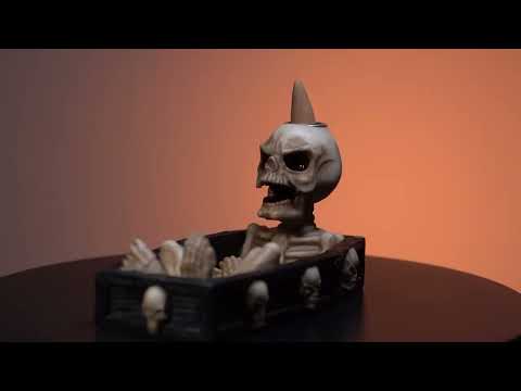 Un mystérieux brûleur d'encens en forme de squelette assis à l'intérieur d'un cercueil. Placer un cône d'encens allumé sur la tête des squelettes pour voir la fumée s'écouler par sa bouche. Convient à la fois pour les bâtons ou les cônes d'encens.