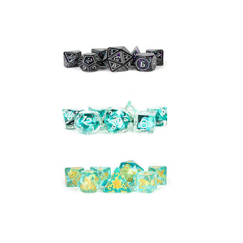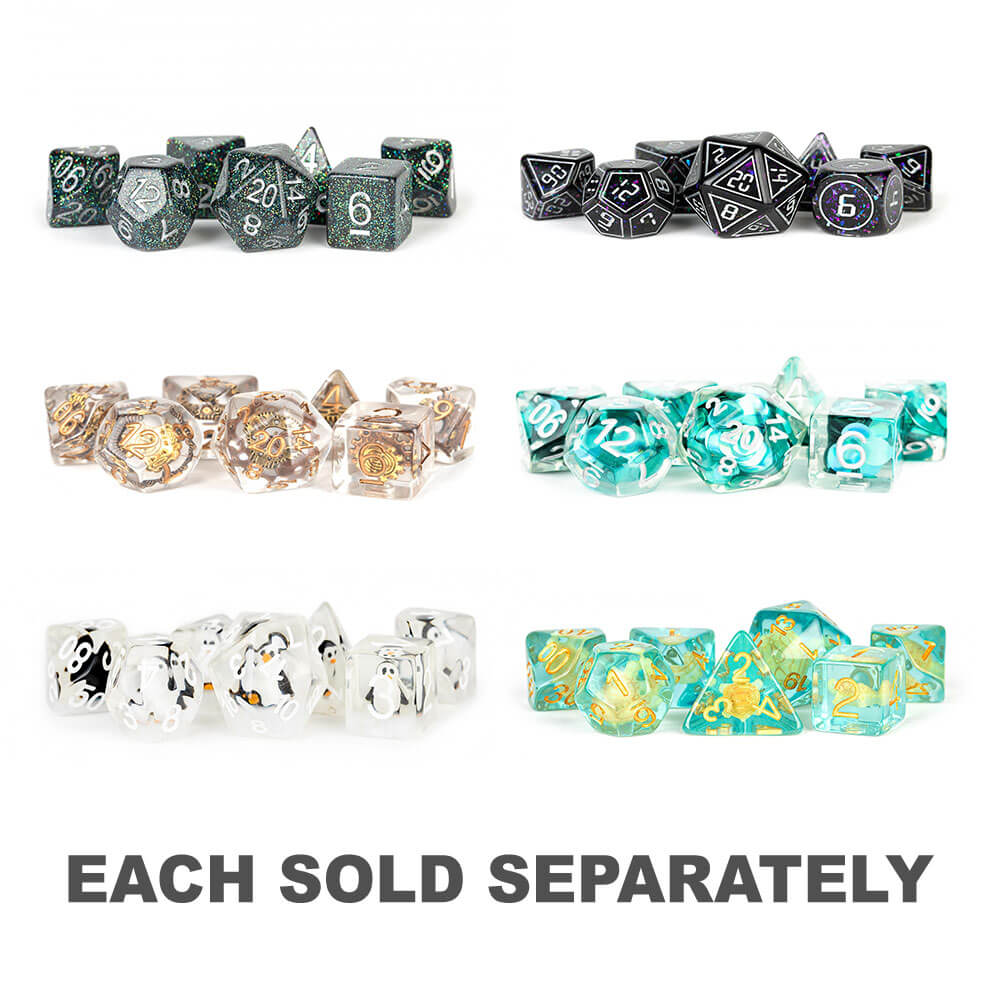Les dés en résine MDG ont des inclusions uniques qui ajoutent de la poussée à n'importe quelle table de jeu. Ce sont des ensembles de dés polyédriques de 16 mm de grande taille fournis avec 7 dés (d4, d6, d8, d10, d10% (00-90), d12 et d20).