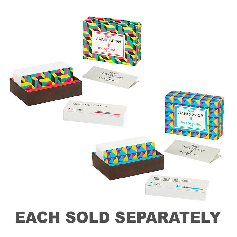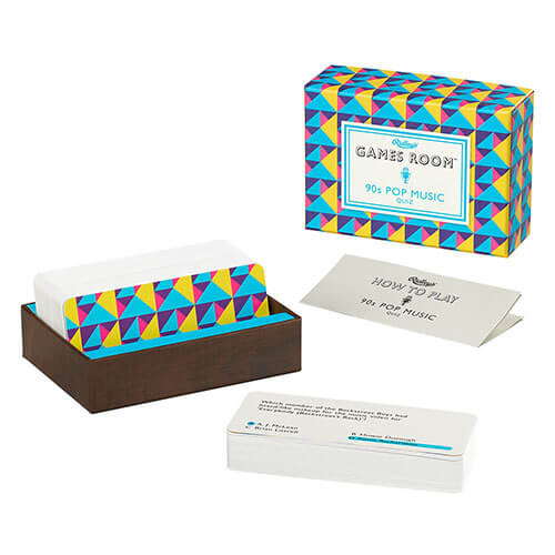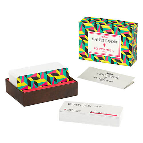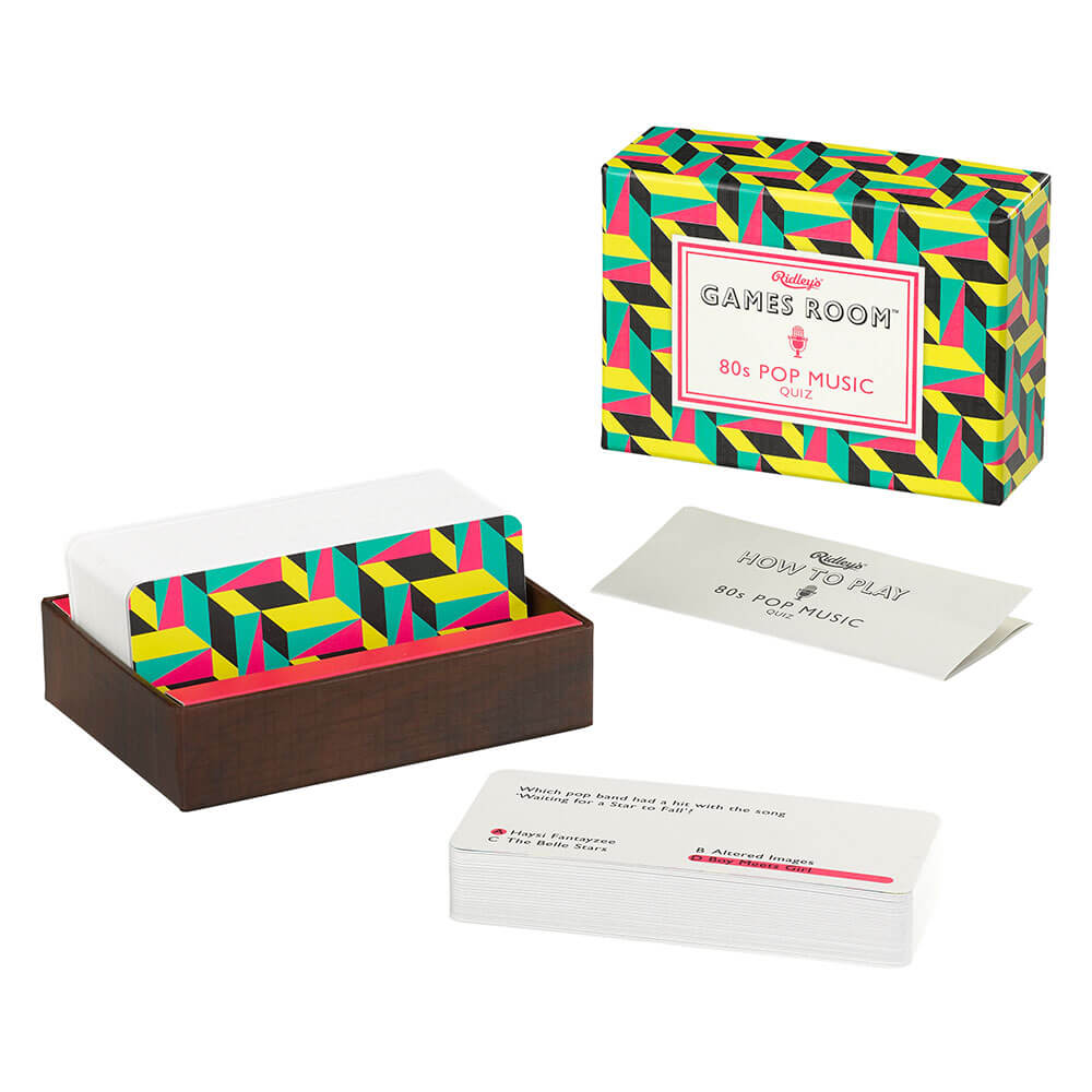 Vous pourrez creuser vos anciennes mixtapes à la fin de ce quiz de musique des années 80, avec 140 cartes de questions à choix multiples présentées dans une boîte géométrique brillante inspirée des années 80.