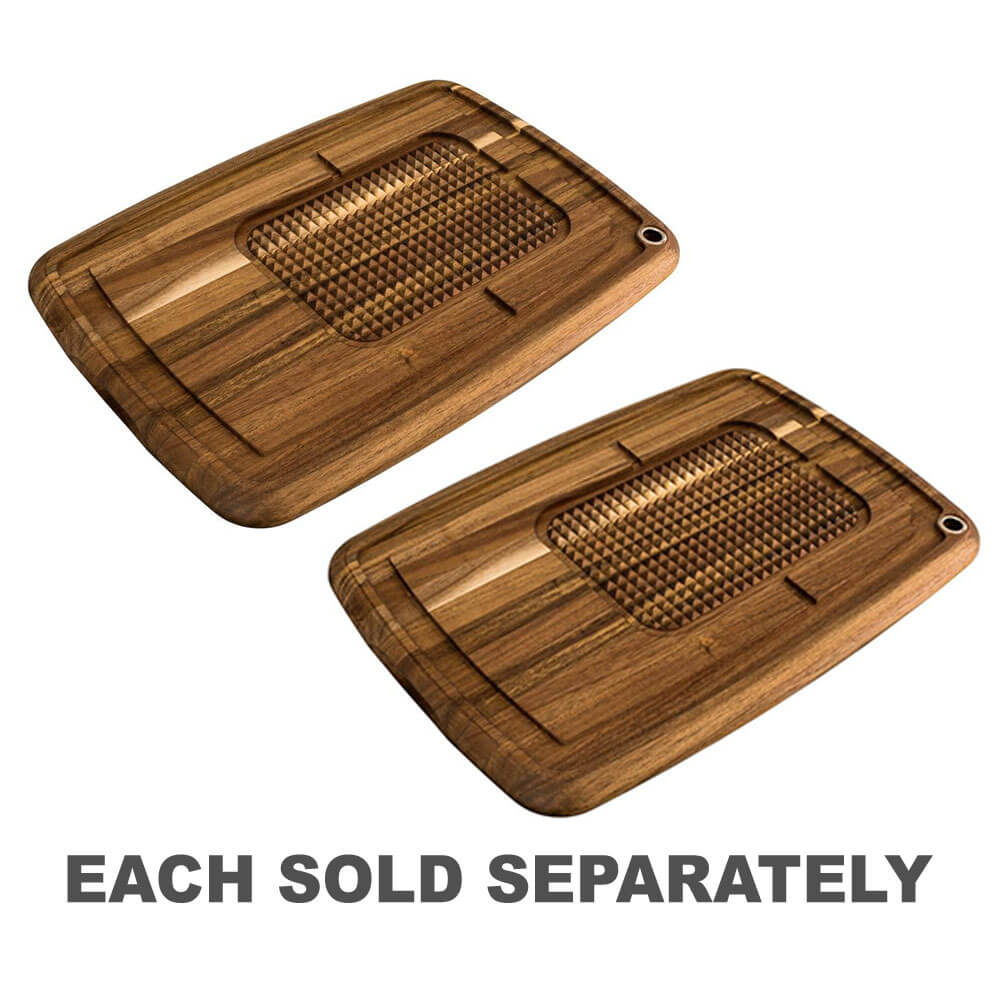 Fabriqué à partir du bois à grains à grain à rivière d'Acacia, cette planche de sculpture dispose d'une grande surface texturée qui stabilise les poulets entiers et les rosbif pendant le processus de sculpture, tandis que les grandes rainures attrapent des jus lâches et gardent vos comptoirs de cuisine impeccables.