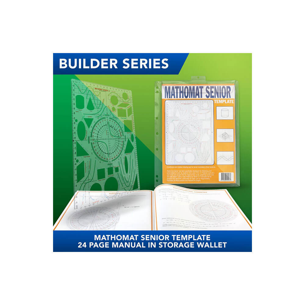 Mathomat Senior è stato specificamente sviluppato per lo schizzo e la presentazione del lavoro scolastico senior. Mathomat Senior include un goniometro centrale che è anche il cerchio unitario per lo studio della trigonometria. Una linea tangente che può essere utilizzata con il cerchio unitario. Curve di grafica per curve di distribuzione di seno, coseno, abbronzatura, quadratica, cubica, parabolica, iperbol e normali di distribuzione della frequenza. Mathomat Senior include forme e contorni di schizzo per solidi 3D utilizzati nel calcolo dell'area e del volume.