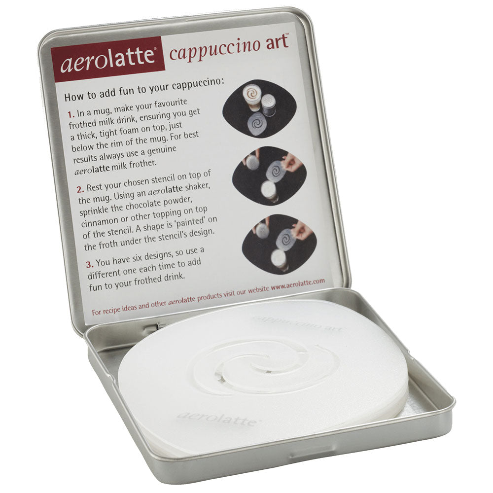 Crea disegni a forma di barista per le tue bevande calde preferite a casa usando gli stencil artistici di cappuccino divertenti di Aerolatte.