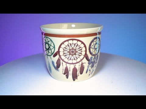 - クリーム色のボウルに羽毛のドリームキャッチャーのデザイン。