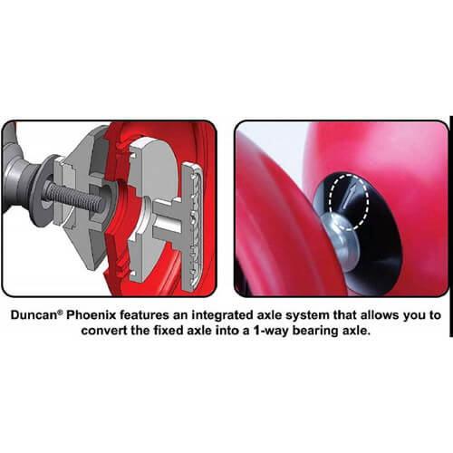 • Uit verwisselbaar lager: Diabolo-spelers hoeven niet langer te kiezen tussen een vaste as en 1-weg lagerdibolo. Met het unieke Duncan Phoenix Diabolo -uitwisselbare lagerontwerp kunt u eenvoudig de knoppen van de omsschoppen tussen vast en draaien met de hand vast te zetten.