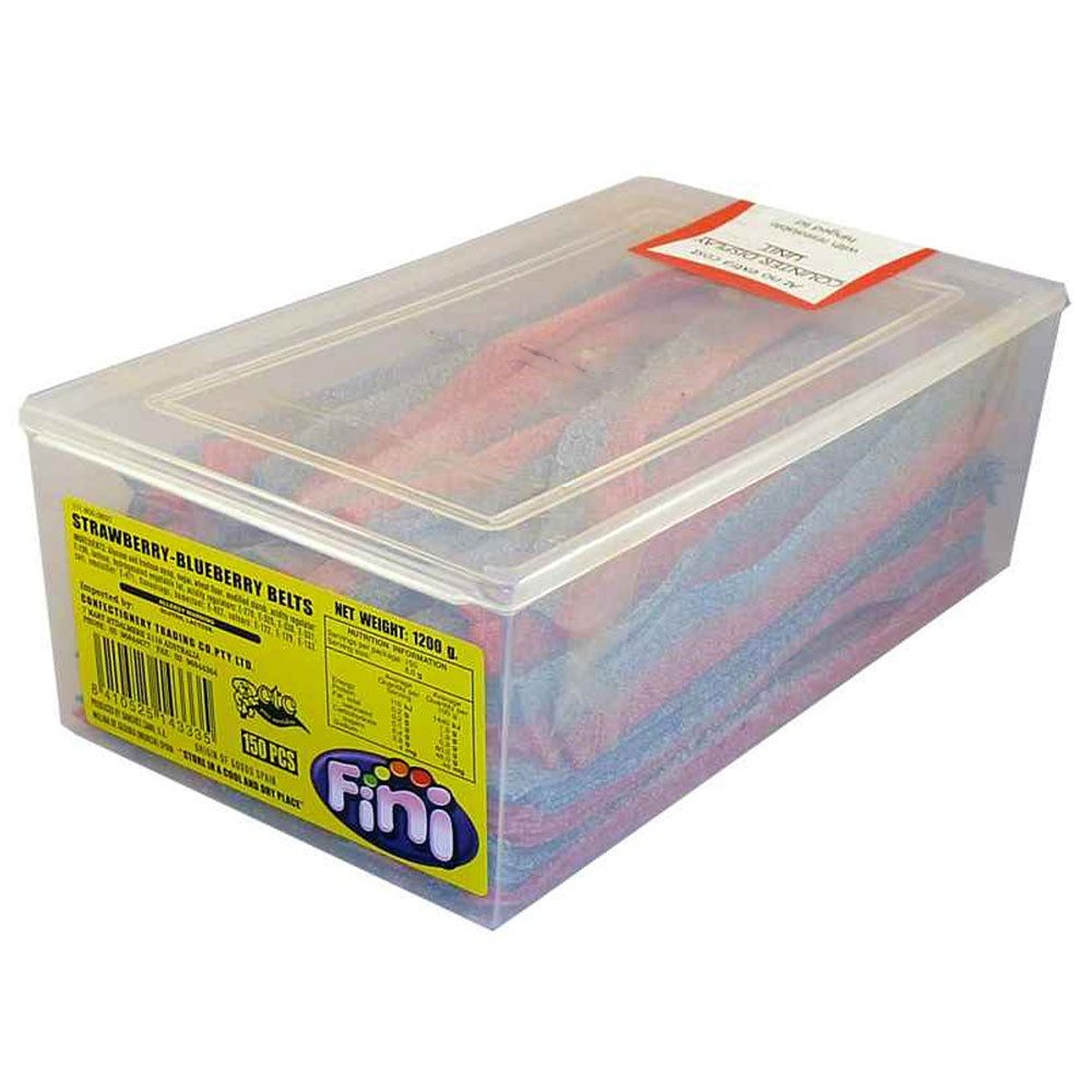 Fini Strawberry en Blueberry -riemen zijn een heerlijke snoepbehandeling die de zoete en sappige smaken van aardbeien en bosbessen combineert. Deze snoepbanden hebben meestal een levendig rood en blauw kleurenschema, dat de twee fruitige smaken vertegenwoordigt. De taaie textuur en heerlijke mix van aardbei- en bosbessensmaken maken ze een populaire keuze voor degenen die genieten van een fruitige en taaie snoepervaring.