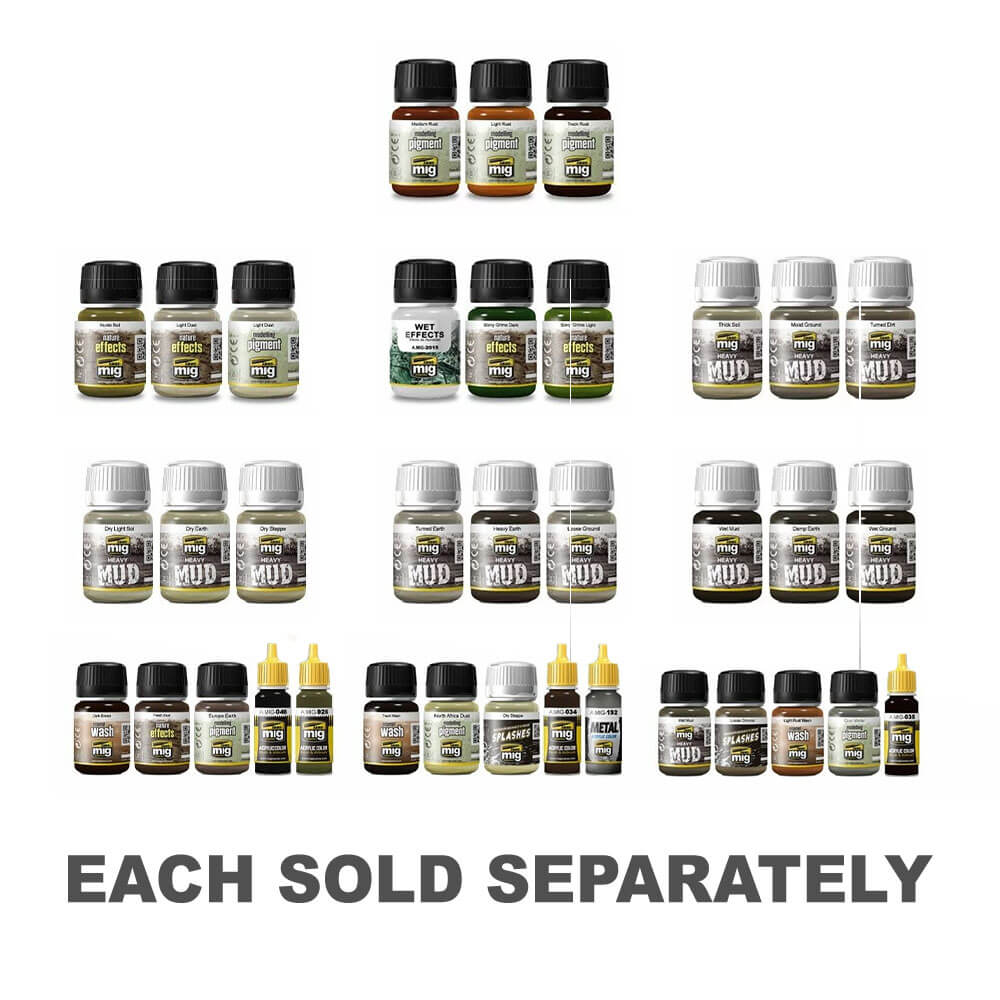 Pigmenty, które potrzebujesz, aby zapewnić swoje zestawy zardzewiały wygląd. Zawiera trzy tony; Pomarańczowy pigment na świeżą i najnowszą rdzę (A.mig Light Rust-3006), ciemniejszy odcień dla starszej rdzy (A.mig Track Rust-3008) i średni stonowany kolor rdzy. (A.Mig -3005 Średnia rdza)