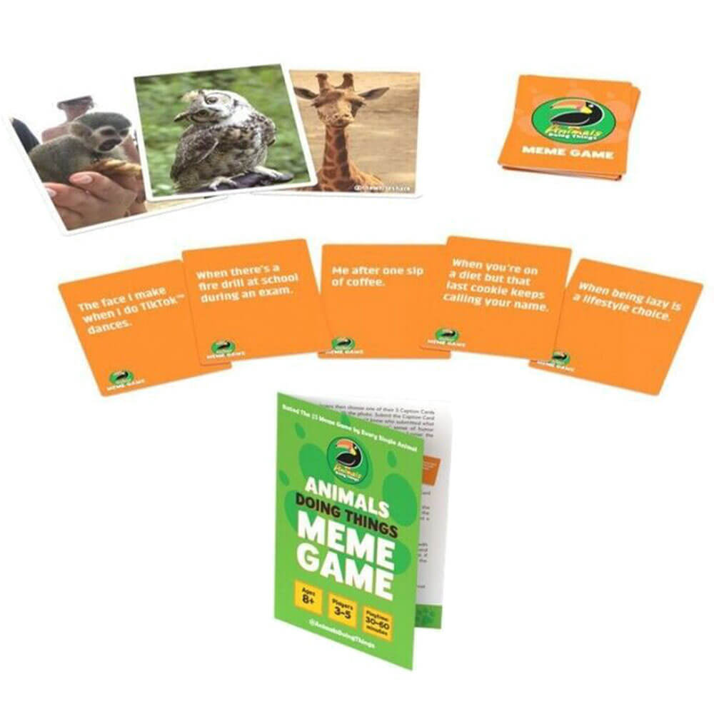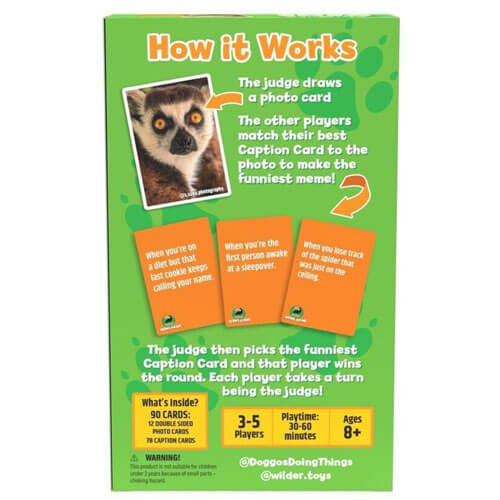 • Leveres med sjove dobbeltsidede fotokort og det sjoveste billedtekst. Par kortene sammen for at få memes, som vil få dommeren til at grine.