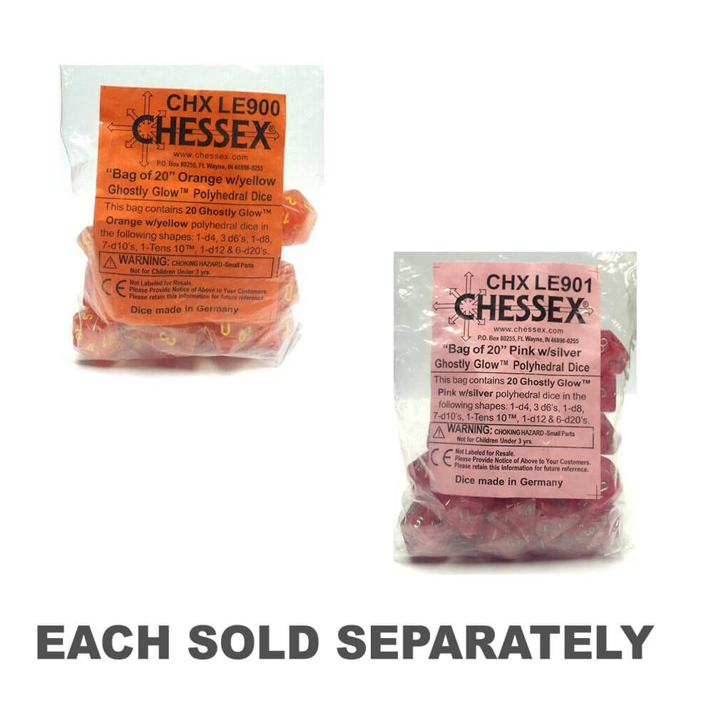 • Køb inkluderer 20 polyhedrale terninger i den spøgelsesrige glødestil