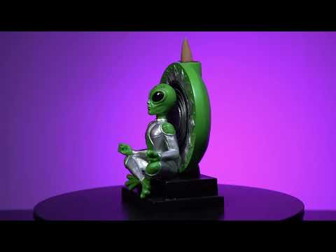 Backflow rökelsebrännare med knäppa hippie främmande design. Främmande bär ett blått och lila huvudstycke med en guld fredssymbol. Doftande rök rinner ner och ut ur utlänningens mun på en livlig blomma när en upplyst rökelse kon placeras på toppen. Lämplig för rökkottar.