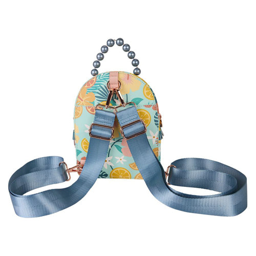 This backpack features a tropical print all over, including 3D embroidered hibiscus flowers. The front pocket is in the shape of a lemon slice, with real beads acting as the seeds! Real fringe details over the side pockets and a beaded top handle complete the look. Oh! And there's a drop pocket on the back for extra space to store things.